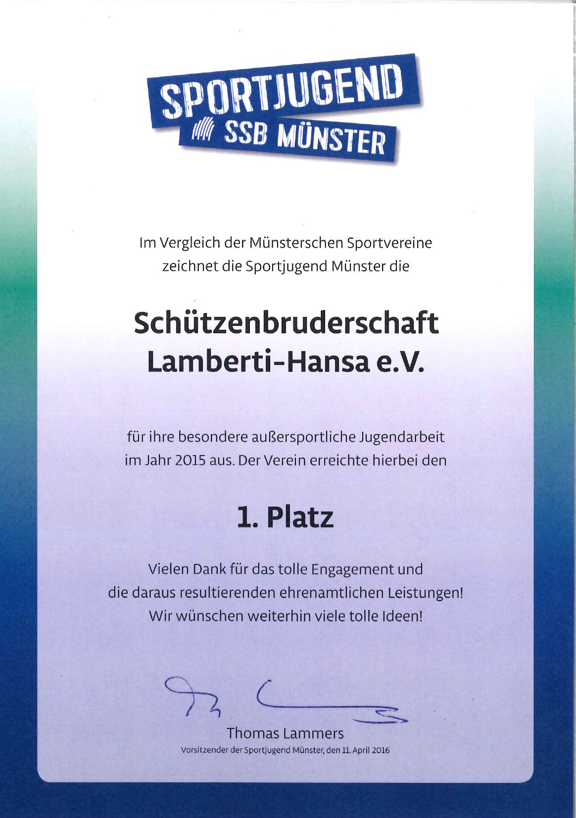 Diese Auszeichnung ist nicht nur eine Auszeichnung für die Bruderschaft Lamberti-Hansa, sondern speziell für alle die sich in der Jugendarbeit der Bruderschaft engagieren. Ein Dank gebührt natürlich auch dem BdSJ LBZ und Diözesanverband, welche mit Ihrer Ausbildungs- und Unterstützungsarbeit für die passenden Rahmenbedingungen sorgen.